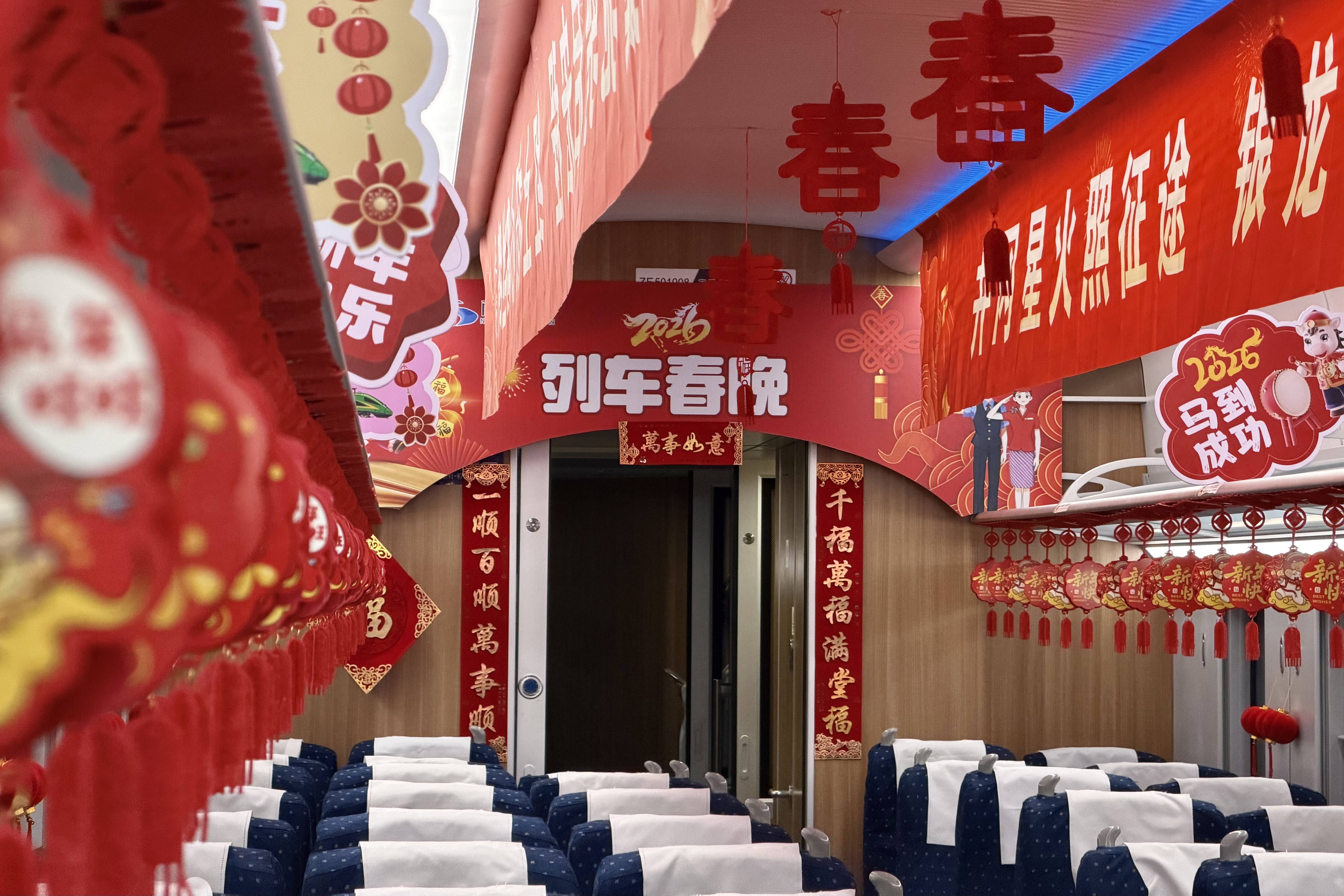 这是举办“列车春晚”的D138次列车车厢。新华社记者陈柱佐 摄“我们在江西旅行结束,准备从北京中转回家过年,买票时完全没想到能坐上这样一趟充满‘年味儿’的列车,也是体验到了‘开盲盒’的乐趣。”李玉卓说,当看到参演的外国友人用中文介绍家乡美食的时候,自己回家的心情更急切了,“不管从哪儿来,大家对美食的思念,对团圆的向往,从来都是相通的”。